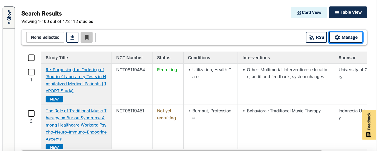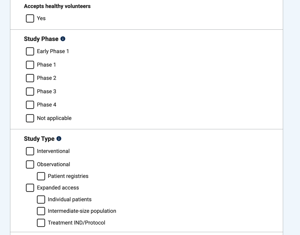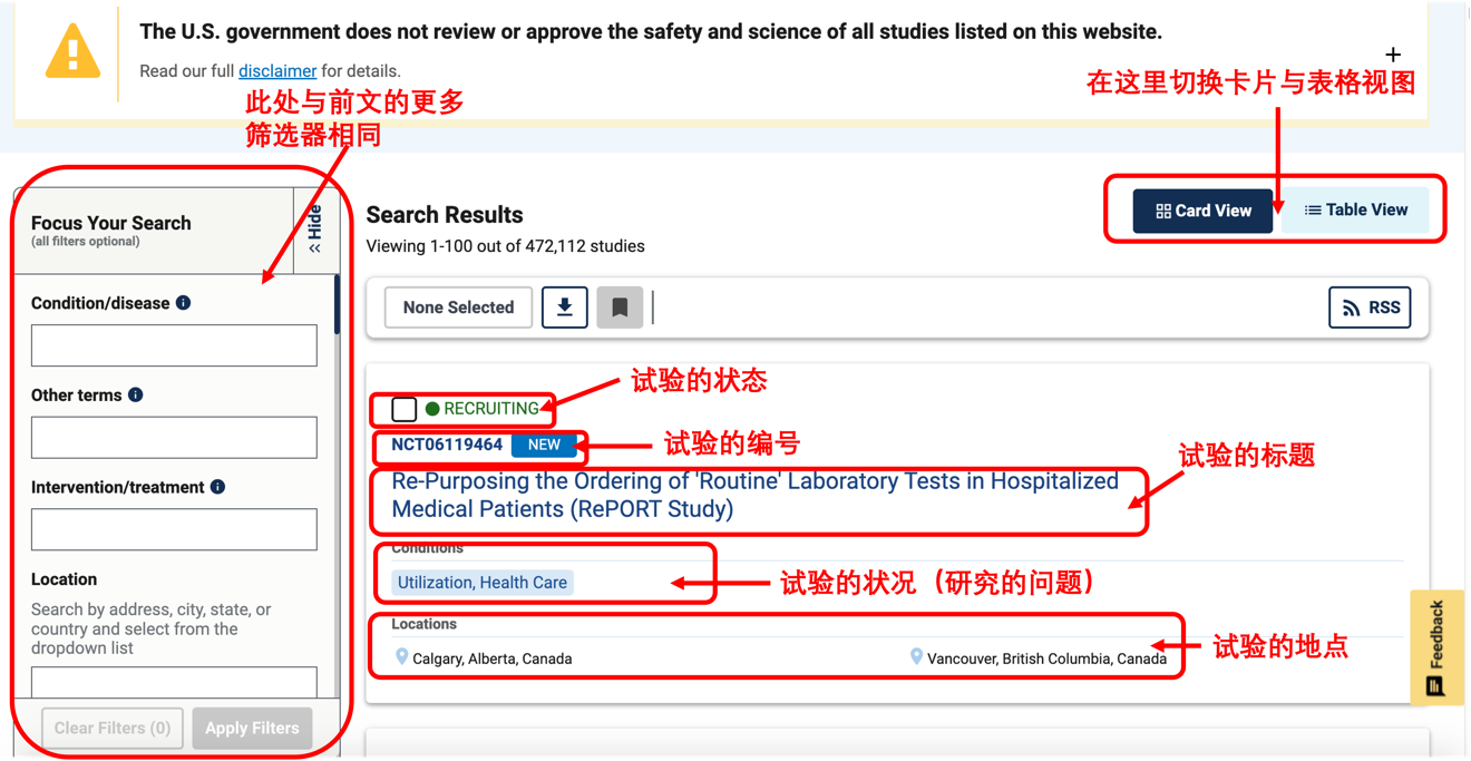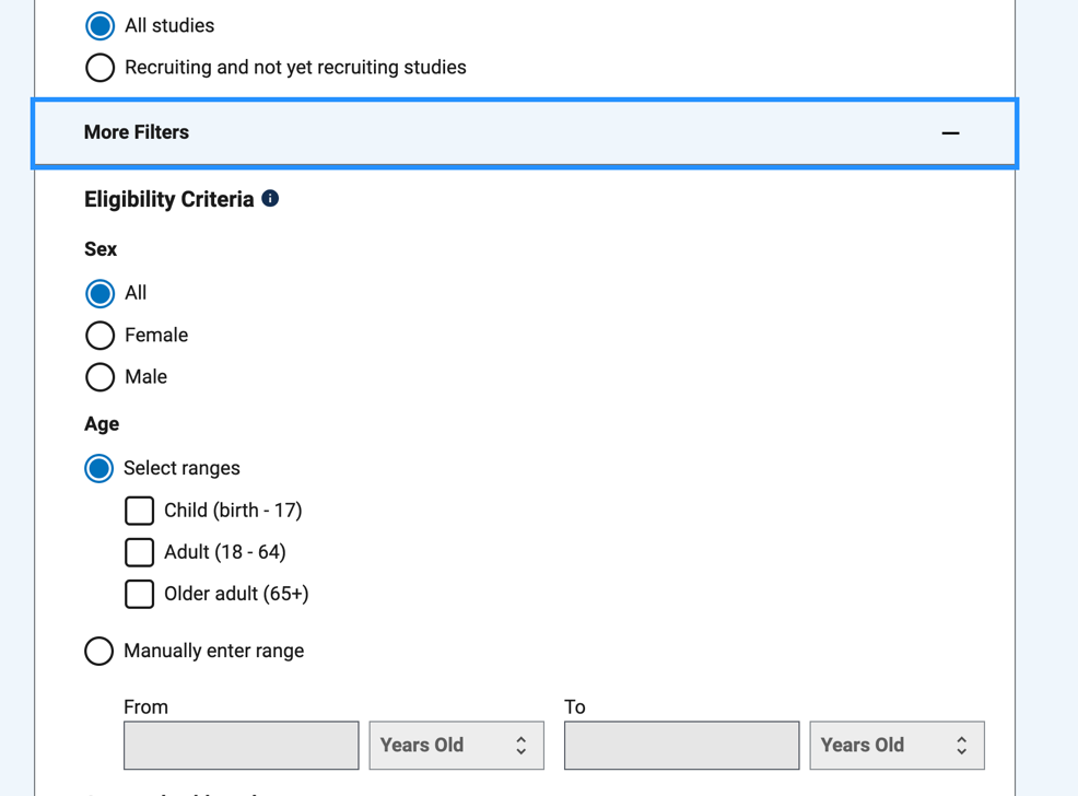 - 学习状态(“All Studies”选择所有研究或 “Recruiting and not yet recruiting studies”仅搜索正在寻找参与者的研究。
