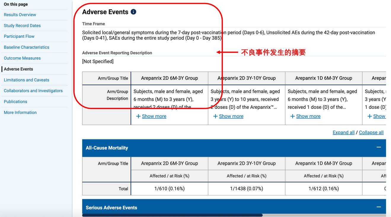 向下拖动可以看到研究过程中不良事件发生的摘要,这里的不良事件为临床研究期间或研究结束后一定时间内发生的受试者健康状况的不利变化,见图 23。
