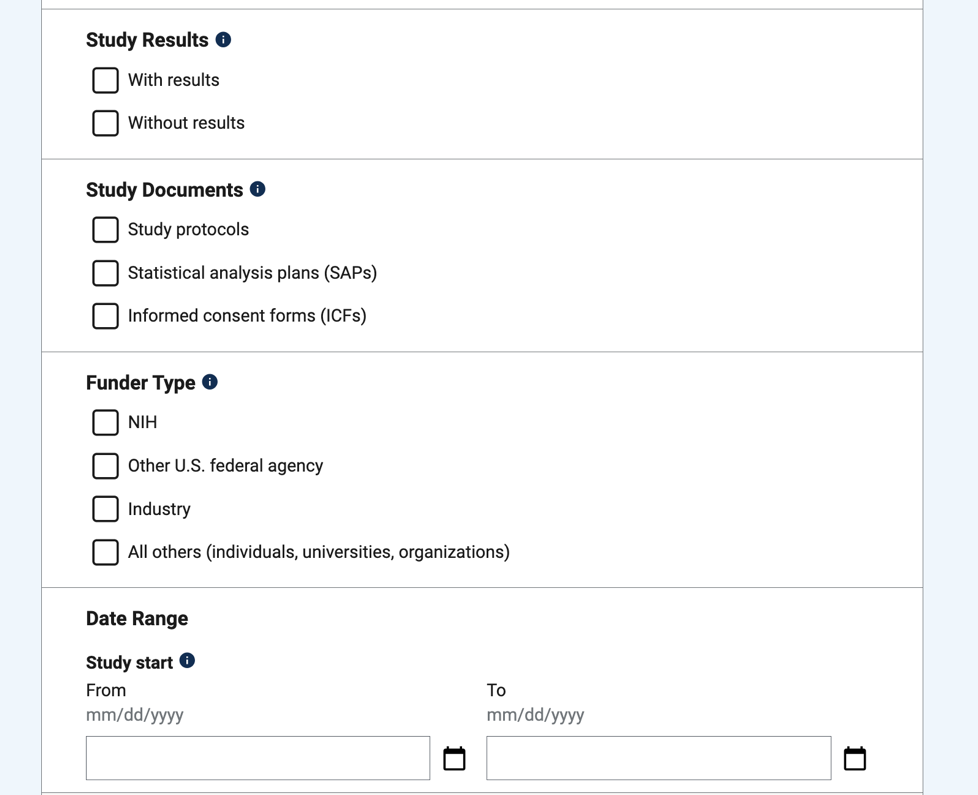 在图 4中可筛选是否已有结果的研究,是否包含研究相关文件(Study Documents)(包括研究方案,统计分析计划SAP,知情同意书ICFs),资助者类型和研究的日期范围。