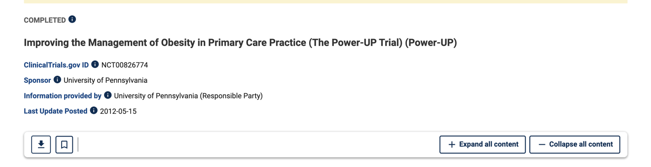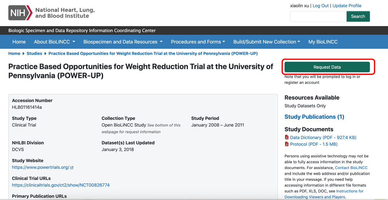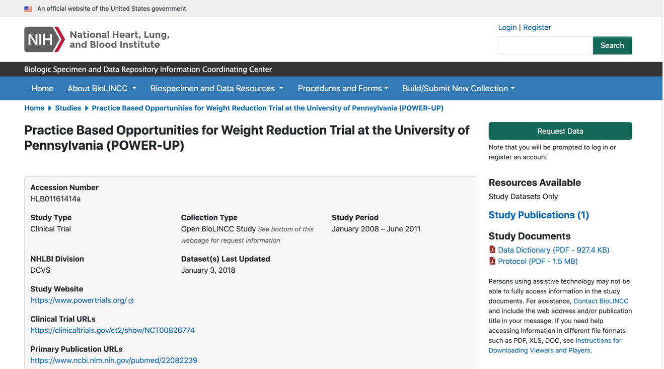 以Improving the Management of Obesity in Primary Care Practice (The Power-UP Trial) (Power-UP)(NCT00826774)(https://clinicaltrials.gov/study/NCT00826774)为例,介绍数据申请流程。