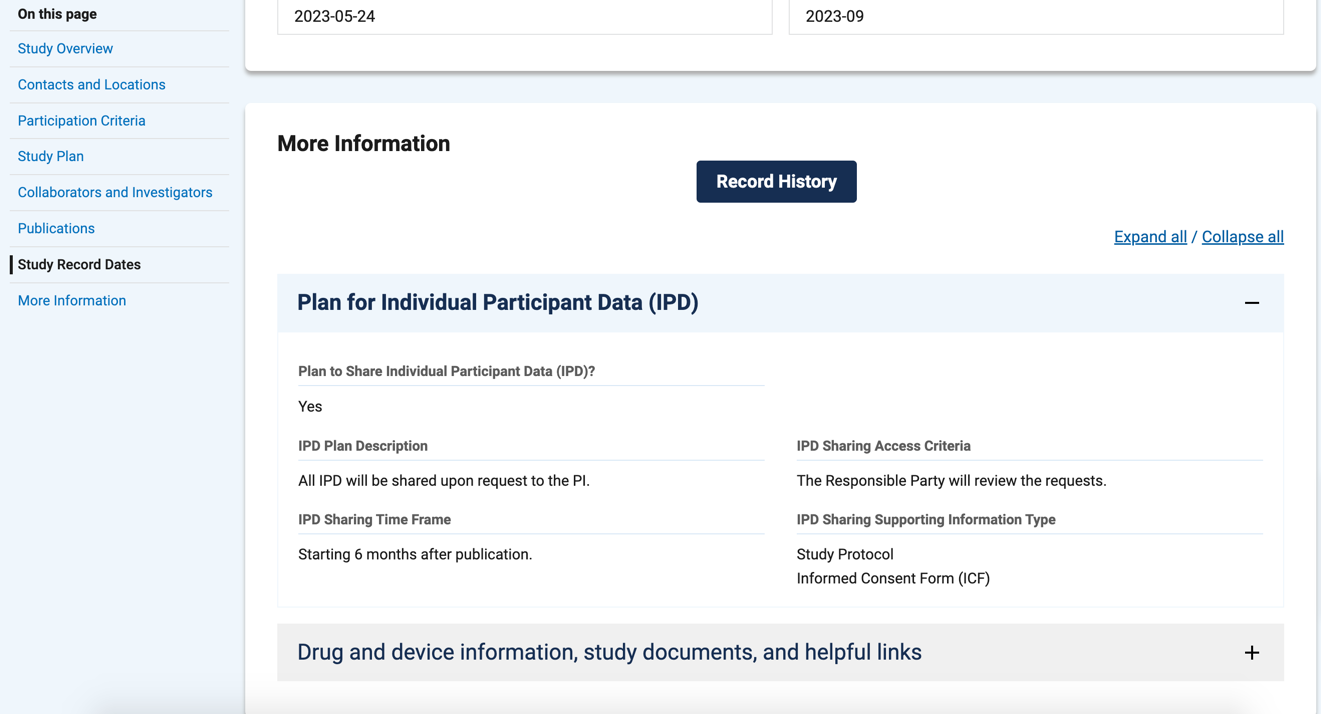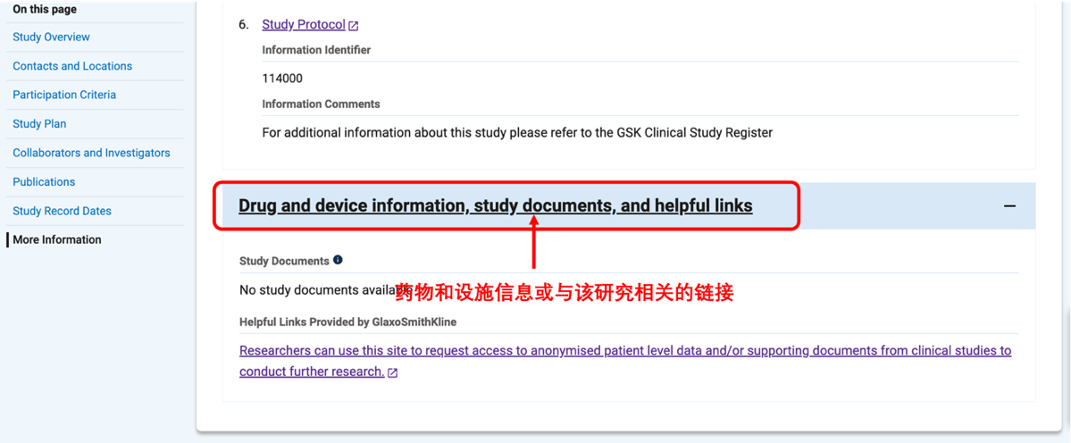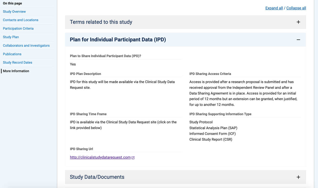 在更多信息中,我们也可以看到关于IPD的信息,这里会标明我们是否可以获得该研究的数据,见图 15。有的试验信息中可能无此选项卡,但仍有获得该数据的可能,可以尝试联系研究者或复制NCT 编码到其它数据库查找。