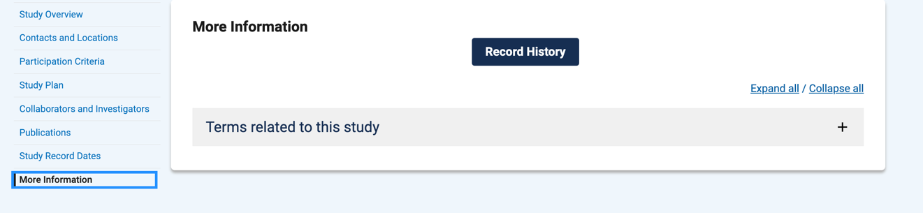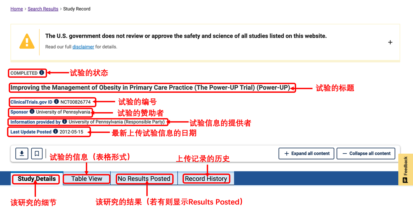 若在具体条目信息中,存在 Results Posted 选项卡则可查看该研究的结果信息(若显示为 No Results Posted 则无该研究的结果信息)。