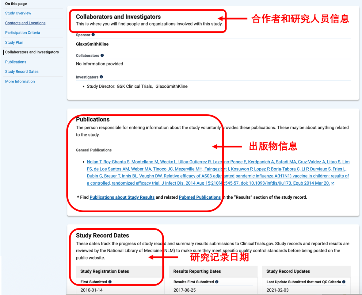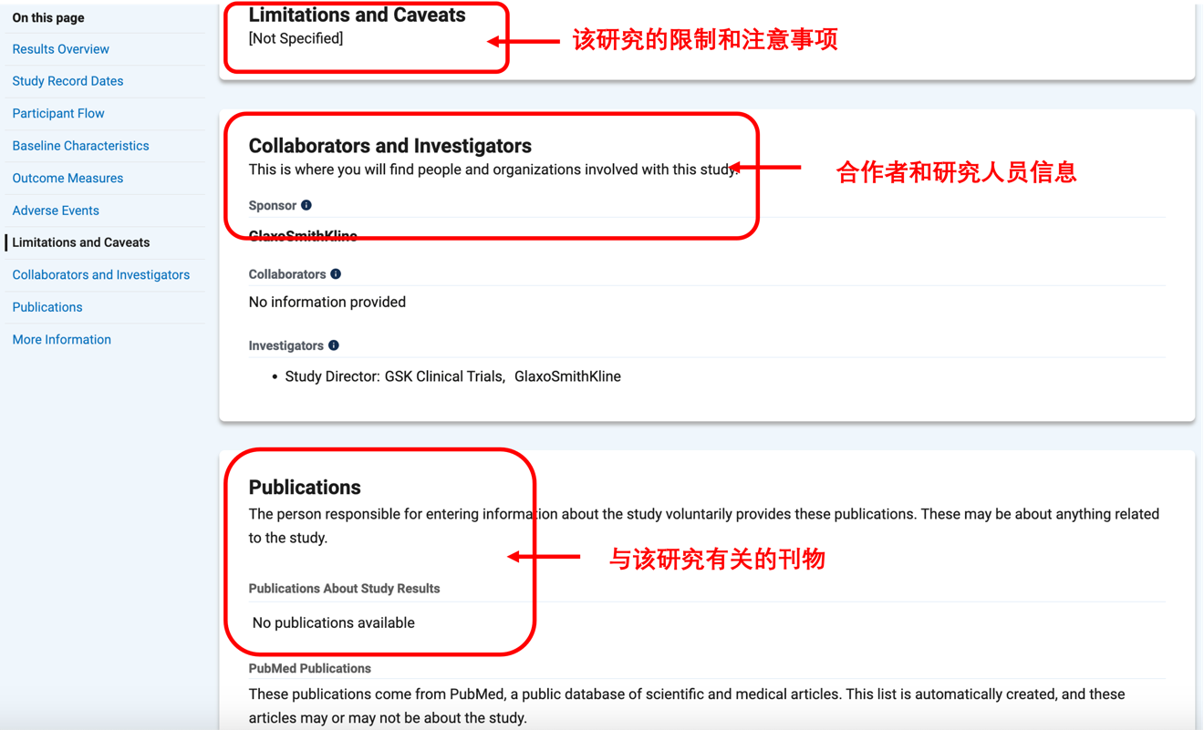 继续向下拖动可以看到该研究的注意事项,合作者和研究人员的信息,以及与该研究有关的出版物,见图 24。