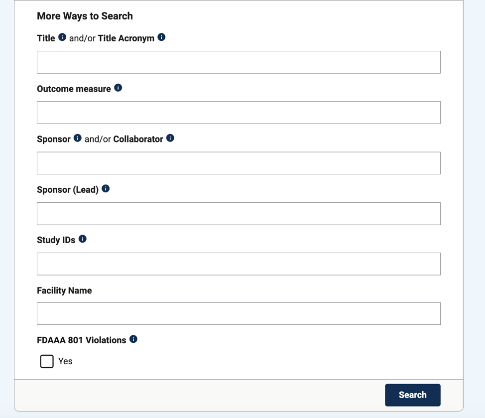 - FDAAA 801 违规:使用此字段搜索违反 FDAAAA 801 的研究。