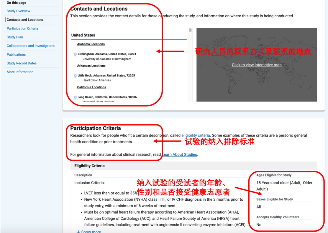 向下拖动,我们可以看到该试验研究人员的联系方式及研究地点和试验的纳入排除标准,见图 10。