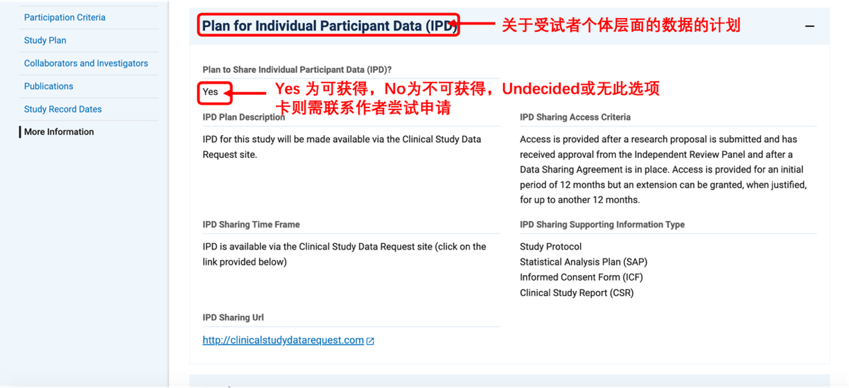 对于IPD 标明非 No情况(包括 Yes, Undecided 或无此选项卡),可以复制该研究的NCT编码到其它数据库网站进行申请。