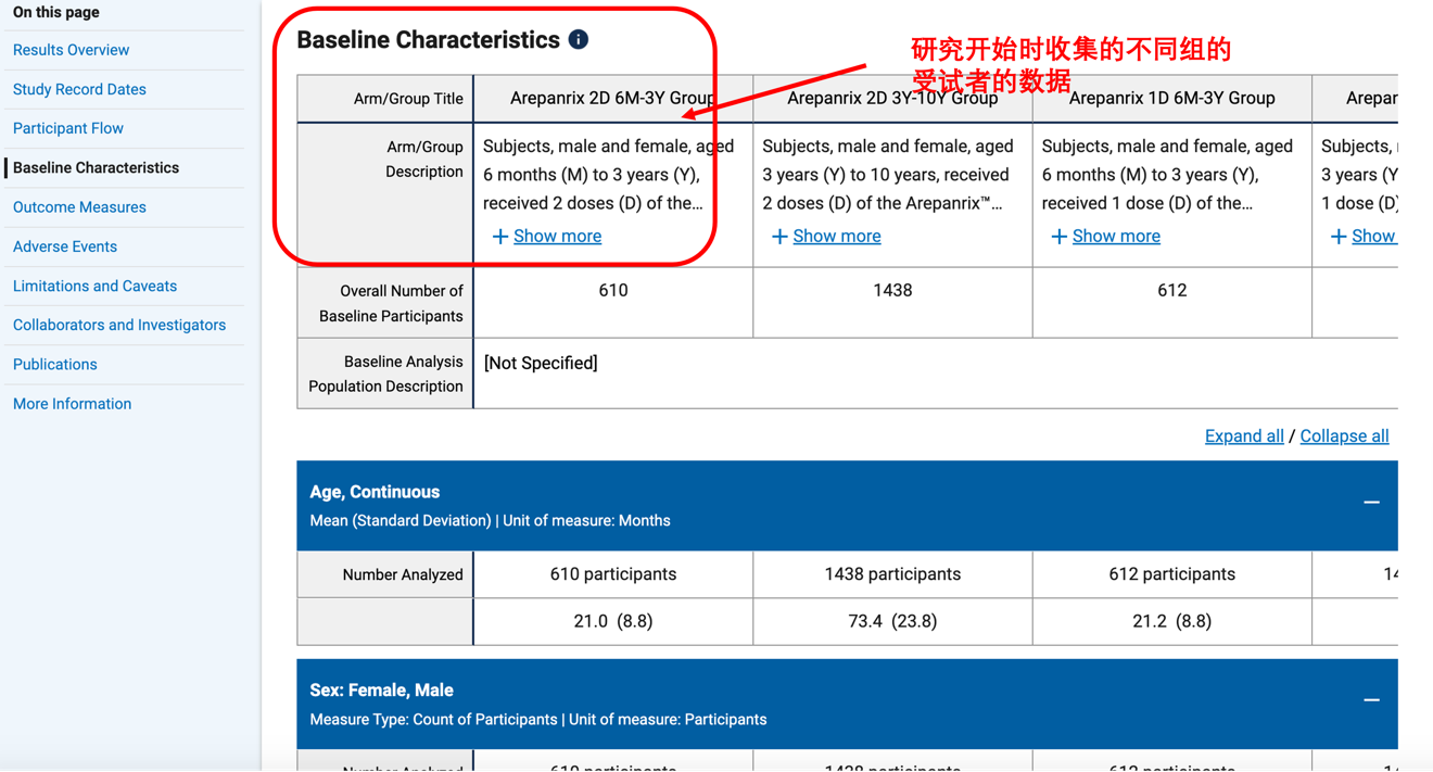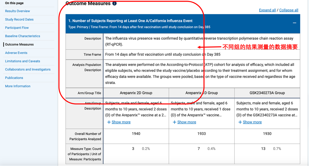 在结果测量中我们可以看到不同组的主要结局指标和次要结局指标结果测量的数据摘要,见图 22。这里的条目一般与研究细节中计划的结果测量相同。
