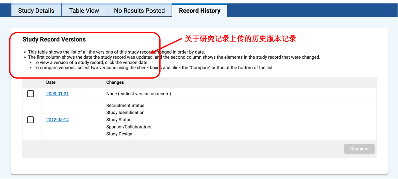 在具体条目信息中, Record History 可以帮助我们查找关于研究记录上传的历史版本记录,见图 25。