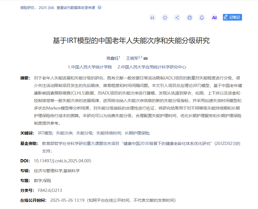 基于IRT模型的中国老年人失能次序和失能分级研究